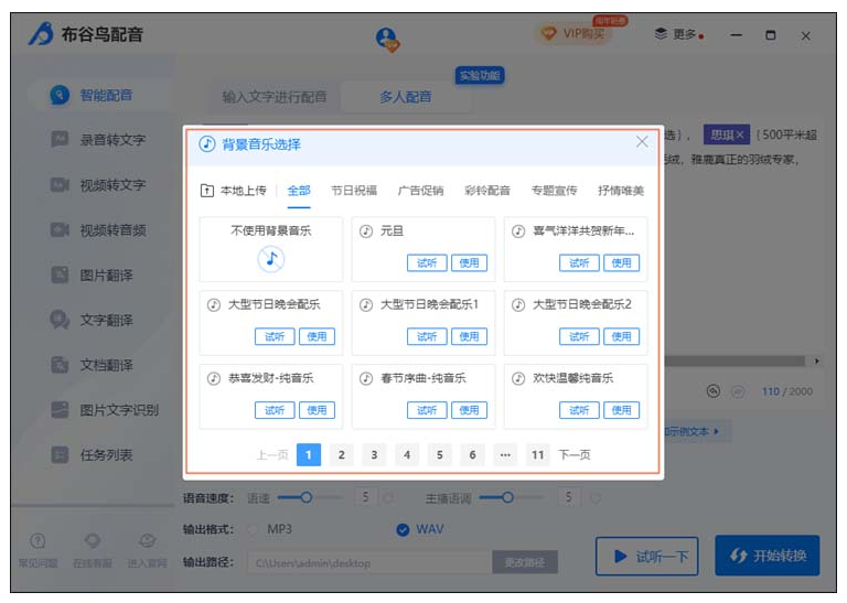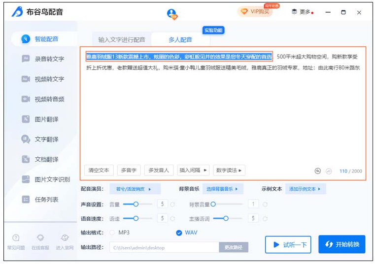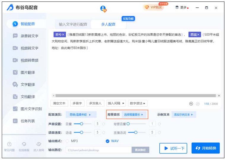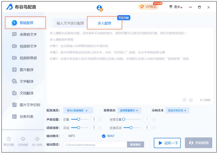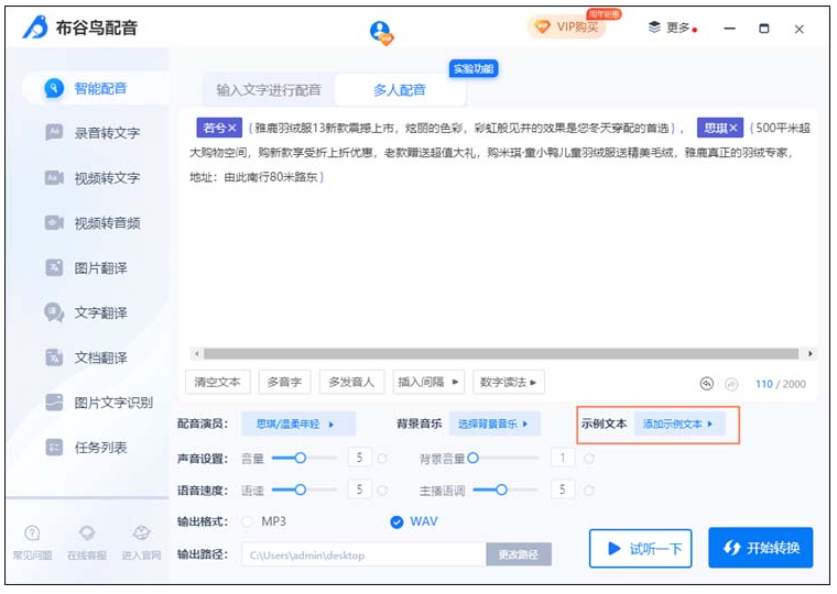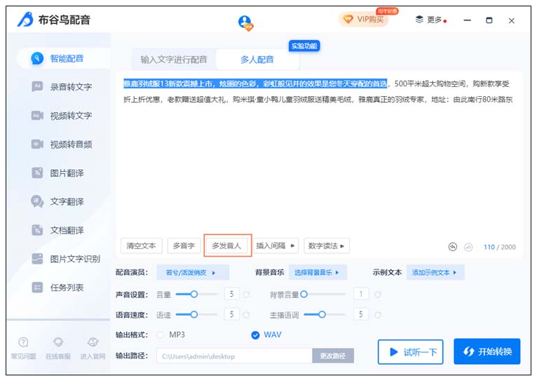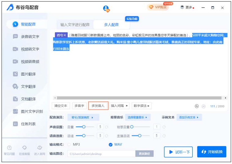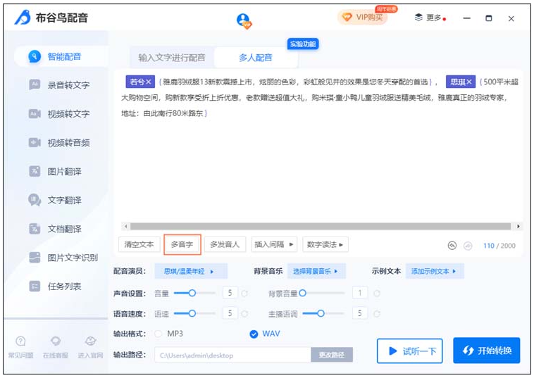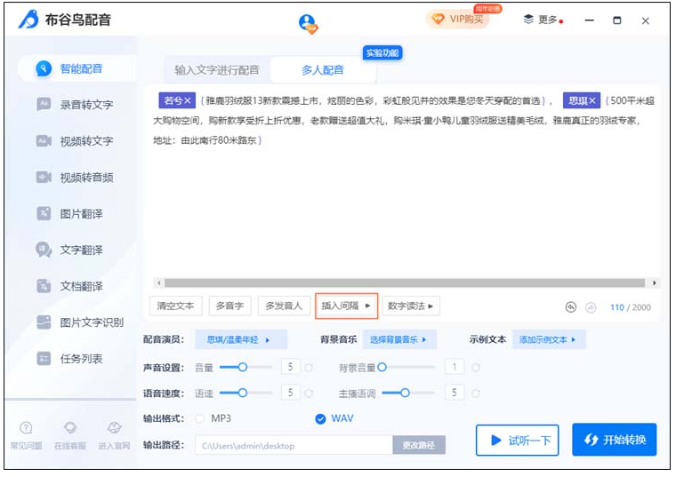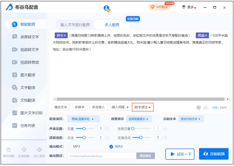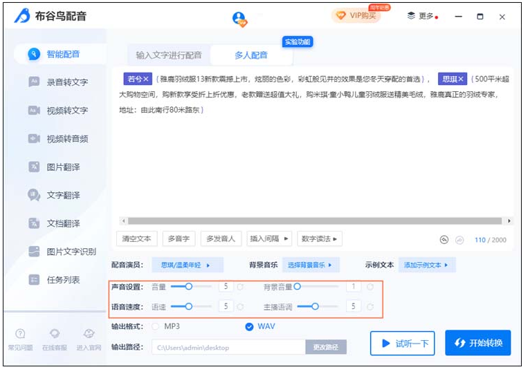 最后可以点击“试听一下”感受一下音频的效果,确认没问题的话就可以点击“开始转换”进行多人配音了